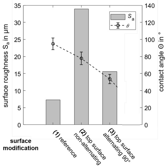 By comparing the surface roughness and contact angles for alternating and non-alternating scanning strategies, both and apparently decrease when applying the alternating scanning strategy. Specifically, the surface roughness drops by to about and the wetting angle by . These values were measured directly after SLM fabrication without any post-processing of the surface. Sand blasting can reduce the surface roughness by about 15%, reaching values of about [45] for titanium, yet being higher than the surface roughness of the reference, which was polished.