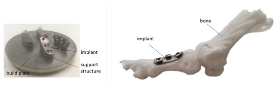 The implications of AM for modern medical applications have been methodically reviewed in several journals—e.g., AM of calcium phosphate ceramics for orthopedic applications, such as bone grafting and drug delivery [10,11], with a particular focus on surgery, preoperative models for fractures and patient-specific surgical guides, and custom specific orthopedic implants [12,13]; regarding the applications in orthopedic surgery, see [14], and for the fabrication of orthopedic implants, see [15,16]. For a recent review on orthopedic implants, including both permanent joint replacements and temporary fracture fixation devices, such as the osteosynthesis plate addressed in this contribution, we refer to reference [17]. With respect to the response of human tissue upon implantation, several in vitro, ex vivo and in vivo studies have addressed questions of general materials’ biocompatibility, cell adhesion, proliferation and osteogenesis [16,18,19,20,21,22].