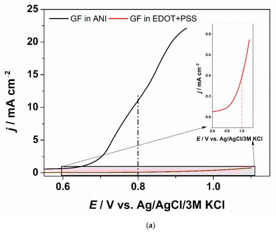 Before starting the deposition process, graphite foil was subjected to a purification process by placing the samples in isopropanol for 10 min. After a series of optimization experiments the electrochemical deposition of PANI was performed in an aqueous solution containing 3 M HCl and 1 M ANI, by potentiostatic polymerization of 0.85 V vs. Ag/AgCl/3 M KCl consuming a charge of 1.5 C·cm−2. Next, the obtained GF/PANI sample was covered by a thin PEDOT:PSS layer via electrodeposition (E = 1.05 V vs. Ag/AgCl/3 M KCl consuming a charge of 0.01 C·cm−2) from 0.015 M EDOT with 0.1 M PSSNa electrolyte. The electrodeposition potential was chosen on the basis of linear sweep voltammetry curves, which are presented in Figure 1a, and were recorded during anodic polarization of the GF electrode in electrolytes containing monomers, aniline, and EDOT, respectively.