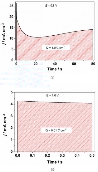 In general, there are two major varieties of supercapacitors, namely, electrochemical double-layer capacitors (EDLCs) and pseudo-capacitors, depending on the charge storage mechanism. In EDLCs energy is stored at the electrode/electrolyte interface via the separation of opposite charges, building an inner layer and a diffuse layer at the electrode/electrolyte interface []. The stored charge is of electrostatic nature, thus EDLC devices have no kinetic limitations [] and as for electrode manufacturing in EDLD, mostly carbonaceous materials are exploited []. On the contrary, in pseudocapacitors reversible and rapid faradaic reactions, strictly limited to the electrode surface, take place. As the charge is related to faradaic processes, not to electrostatic ones, some kinetic limitations may occur. The nature of pseudocapacity is linked with active surface groups, taking part in electron charge transfer. The term pseudocapacity describes the behavior of electrode materials which have the electrochemical signature of a capacitive electrode [,], that is, the straightforward relation of the charge stored with the potential window range []. Generally, pseudocapacitors can deliver significantly more specific capacitance and energy density than EDLC [,]. Electrode materials have a major impact on the electrochemical performance of supercapacitors. In general, they can be divided into carbon-based materials, transition metal oxides and conducting polymers [,].