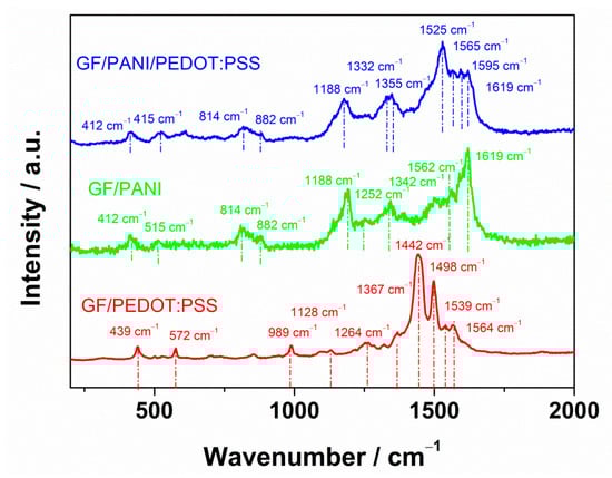 In the Raman spectrum of GF/PEDOT:PSS, shown in Figure 3, typical bands of the polymer were identified. The PEDOT:PSS spectrum exhibits the most intense and well-shaped peak located at 1442 cm−1 and also one at 1498 cm−1, which refer to symmetrical Cα=Cβ vibrations in the thiophene ring. The bands located in the range from 1539 to 1564 cm−1 can be assigned to asymmetrical Cα=Cβ stretching modes in polymer chains. Furthermore, bands at 1367, 1264 and 1128 cm−1 can be found and ascribed to single bonded carbon atoms: Cα–Cα’ inner ring stretching, C–O–C ring deformation and Cβ–Cβ’ stretching, respectively []. Moreover, some bands can be observed in the region between 989 and 439 cm−1, which are due to oxyethylene ring deformations. It is noteworthy that spectra obtained for PEDOT:PSS films typically contain all these features [,,].