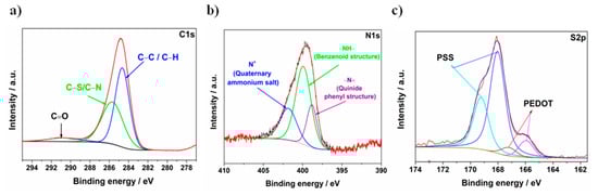 XPS spectra of GF/PANI/PEDOT:PSS: (a) C1s, (b) N1s and (c) S2p.