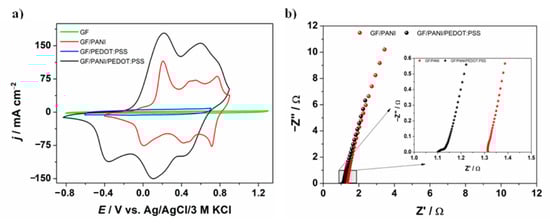 The electrochemical performance of GF/PANI and GF/PANI/PEDOT:PSS electrode materials in a three-electrode system was investigated, using obtained materials as the working electrode. The comparison of the CV curves of a GF/PANI and a GF/PANI/PEDOT:PSS composite is presented in Figure 5a. The CV curves for GF and GF/PEDOT:PSS are also presented for comparison. Both electrodes (GF/PANI and a GF/PANI/PEDOT:PSS) exhibited characteristic peaks of redox couples of polyaniline []. The current density of a GF/PANI/PEDOT:PSS electrode is larger than that of the GF/PANI electrode. Comparing the current densities of polyaniline and PEDOT:PSS separately, it can be concluded that it is not simply the sum of the current utilized for oxidation/reduction of both polymers. The synergy between materials should positively affect the amount of the accumulated charge. It is worth mentioning that PEDOT:PSS plays an important role in increasing electroactivity of the material, as well as it may contribute to expanding the specific surface area of the electrode. Moreover, the presence of PEDOT:PSS affects the widening of the electroactivity potential range as PEDOT:PSS is electroactive in a more cathodic potential range and its pseudocapacitive activity takes place in the negative potential region up to −0.9 V. On the other hand, PANI pseudocapacitive activity mostly covers the positive potential region. Moreover, the PEDOT:PSS film is known to behave as a material permeable for cations in the potential range of the PEDOT doped state [,]. Electrochemical quartz microbalance studies proved the selectivity of ionic transport as limited to hydrated cations []. Thus, the PEDOT:PSS cover on top of polyaniline can act as an ion-selective membrane permeable for protons.