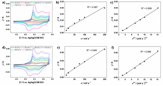 Cyclic voltammetry curves registered at different scan rates for (a) GF/PANI and (d) GF/PANI/PEDOT:PSS; plots of j = f(v) and j = f(v1/2) at E = 0.3 V for GF/PANI (b,c) and GF/PANI/PEDOT:PSS (e,f).