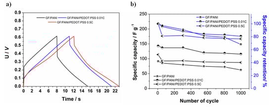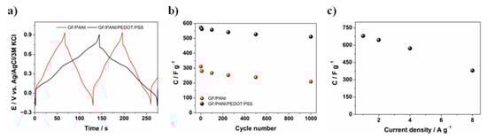 (a) Galvanostatic charge/discharge curves recorded for GF/PANI and GF/PANI/PEDOT:PSS electrode materials; (b) capacity retention after 1000 cycles of GF/PANI and GF/PANI/PEDOT:PSS electrode materials; (c) specific capacity in the function of current density applied.