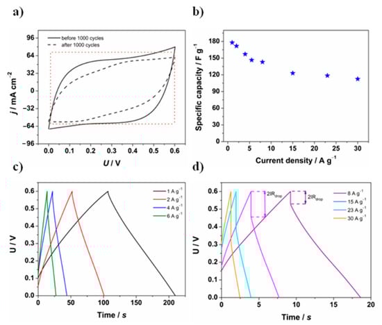 Charge/discharge measurements were performed at different current densities and even under high current density values (Figure 8b) they maintained a symmetric quasi-triangular shape, which provided a high specific capacitance, which may be observed in Figure 8c,d. While increasing the current density value, a decrease in specific capacity is detected. This phenomenon is mainly associated with the rise of the internal resistance value and thus the 2IRdrop, which relates to the internal resistance of the electrode material [,]. Its occurrence is frequently said to be caused by the low electron and ionic transfer rate []. Apart from the huge impact on the specific capacity, the higher value of ESR contributes to the reduction in power density of the device and consumption of energy during charging.