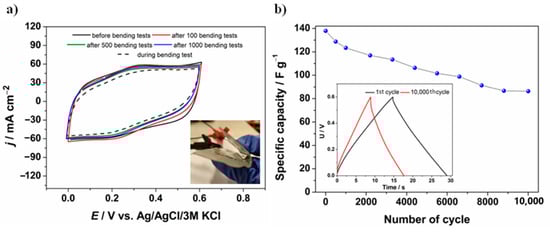 (a) Cyclic voltammetry curves recorded for a symmetric GF/PANI/PEDOT:PSS supercapacitor before and after bending tests, as well as during bending (v = 50 mV·s−1); inset: image of the bent GF/PANI/PEDOT:PSS symmetric supercapacitor; (b) Specific capacity as a function of the number of cycles performed for a symmetric GF/PANI/PEDOT:PSS supercapacitor after 10,000 bending tests; inset: charge/discharge curves at 1st and 10,000th charge/discharge cycle.