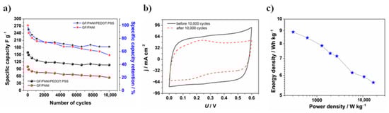 (a) Specific capacity retention after 10,000 cycles for a GF/PANI and a GF/PANI/PEDOT:PSS (Q = 0.01 C·cm−2) symmetric supercapacitor; (b) cyclic voltammetry curves (v = 50 mV·s−1) recorded for a GF/PANI/PEDOT:PSS symmetric supercapacitor before and after 10,000 charge and discharge cycles and (c) Ragone plot for a GF/PANI/PEDOT:PSS symmetric supercapacitor (each star indicates the energy density value for calculated power density at different current densities applied).