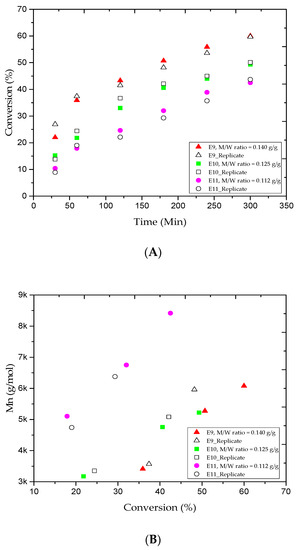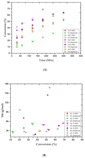 The monomer conversion for each experimental run was repeated two times and a one-time repeat of GPC analysis for each sample collected in all cases. In addition, fully independent replicates were performed for runs E1 to E13. The values were plotted in the successive figures to prove the reproducibility of the data. In this study, the values of Ð and Mn of the replicated trials were reported at 1 and 3 h only for both experimental sets. However, for the first experimental set, monomer conversion of PMMA samples were analyzed in series at 0.5 and 3 h for E1_Replicate and at 1 and 3 h for E2_Replicate.