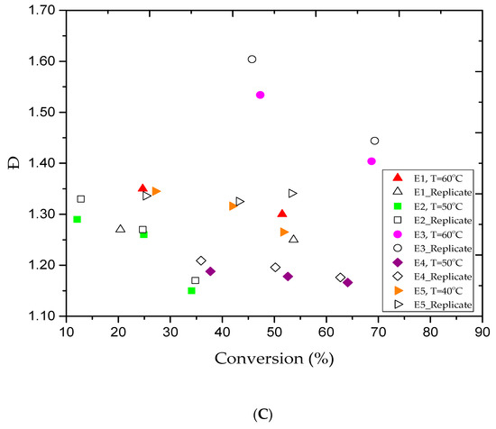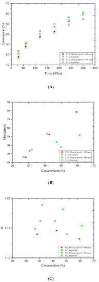 Even though, significant advances have been achieved in emulsion polymerization, the fundamental concept of mixing, which is the basis for the formation of an emulsion mixture, has not been fully delineated [48,49,50]. Therefore, the impact of stirring speed on the MMA conversion rate and average MWD was examined in this study. The polymerization process was carried out at a constant stirring speed throughout the reaction. Figure 4A shows the gradual increase in the MMA conversion versus reaction time for the E12 and E13 trials. In our case, when the stirring speed increased from 100 to 150 rpm, the polymer content increased from 28.2% to 59.3% and 30.6% to 61.2% for the 1 and 5 h reaction times, respectively. At lower stirring speed, the trials had a longer induction time before the MMA conversion rate increased [51]. Figure 4B,C shows the variations in the Mn and Ð values of the samples collected from the E12 and E13 trials and during the same reaction period. According to Table 2, the Mn values increased from 2.6 to 7.8 and 3.3 to 5.1 kg/mol, while the Ð value decreased from 1.14 to 1.13 and 1.16 to 1.15, respectively. Consequently, the good emulsification and recirculation in the E4 trial has led to observe better MMA conversion rate, Mn, and Ð compared with E12 and E13 trials. In other words, we conclude that increasing the stirring speed has enhanced the homogeneity of emulsion AGET ATRP [52].