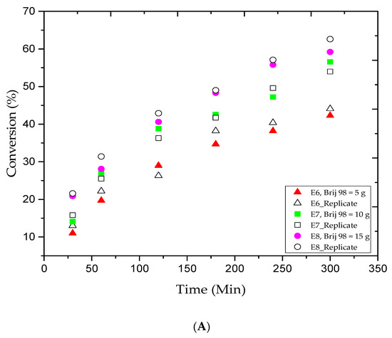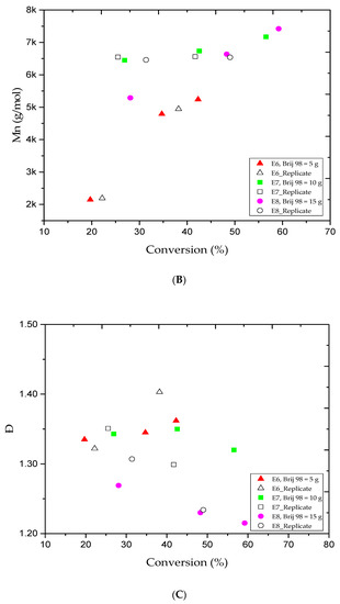 The selection of surfactants in AGET ATRP emulsion is crucial. A suitable amount of surfactant is required to stabilize the latex, but the particular surfactants must not react with the other species in the medium. Figure 2A shows the MMA conversion versus reaction time for the E6, E7, and E8 trials. The plotted data indicate that the addition of more Brij 98 (from 5 to 10 and 15 g) will boost the MMA conversion rate. As a result, from 1 to 5 h of reaction time, the MMA conversion rate progressively increased from 19.7% to 42.3%, 26.9% to 56.6%, and 28.1% to 59.2%, respectively, as listed in Table 2. The results were in agreement with our outcomes in earlier trials, which confirms that additional surfactant causes more micelles to nucleate and produces more PMMA. Figure 2B,C illustrate the Mn and Ð variations versus the MMA conversion rate for the E6, E7, and E8 trials. The data collected by GPC analysis indicated a controlled ATRP polymerization since the average molar mass of the PMMA products increased along with the MMA conversion rate. For example, Table 2 shows that for the 1, 3, and 5 h reaction times, the Mn values obtained were low and gradually increased from 2.1 to 5.2, 6.4 to 7.1, and 5.2 to 7.4 kg/mol, respectively. Moreover, the E6 and E7 runs showed a slight lack of consistency, as the Ð value slightly increased and then narrowed, while in E8 trial, the Ð value consistently decreased as more MMA was converted. Based on the results obtained, one may say that the latex stability is one of the major challenges in emulsion AGET ATRP, and it is highly affected by the surfactant type and amount.