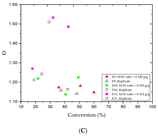 For experiments E9–E11: (A) methyl methacrylate (MMA) conversion rate versus reaction time, (B) variations in the experimental number-average molar mass (Mn) versus methyl methacrylate (MMA) conversions, and (C) variations in the polydispersity index (Ð) versus methyl methacrylate (MMA) conversions.