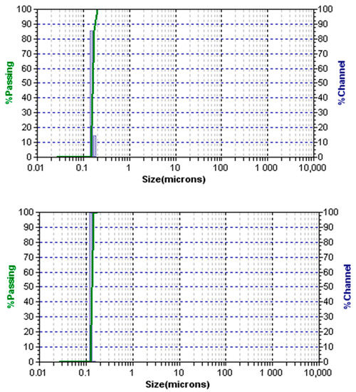 The Microtrac analysis presented in Figure 6 shows an average particle size of approximately 154 nm for E2 trial and 133 nm for E4 trial after 5 h of reaction time. The E4 trial received more surfactant. Therefore, larger areas between the dispersed and continuous phases are covered by the addition of the adsorbed surfactant, which caused the particle size to diminish.