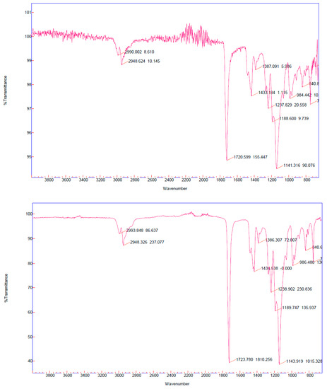 Figure 7 displays the FTIR spectrometry analysis of the PMMA sample collected after 3 h of polymerization for the E2 (top) and E4 (bottom) trials, respectively. There is a distinct absorption band ranging from 1140 to 1240 cm−1. This was attributed to the C–O–C stretching vibration. The bands at 1386.5 and 748 cm−1 are attributed to the α-methyl group vibrations. The band at 986 cm−1 is the characteristic absorption vibration of the PMMA, along with the band at 840 cm−1. In both cases, the band at 1721.5 cm−1 shows the presence of the acrylate carboxyl group. Furthermore, the band at 1434 cm−1 can be attributed to the bending vibration of the C–H bonds of the –CH3 group. The two bands at 2991 and 2948 cm−1 can be attributed to the C–H bond stretching vibrations of the –CH3 and –CH2– groups, respectively. Based on the above discussions, it can be concluded that the prepared polymer for all trials was indeed a macromolecular PMMA [53].