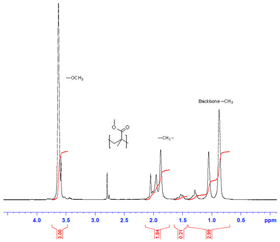 Figure 8 displays the 1H-NMR structure characterization for PMMA sample collected at 3 h of reaction time for E2 trial. The proton methyl group (n-C(CH3)(COOCH3)) was observed by the chemical shift at 0.84–1.25 ppm. The peak at 1.88–2.08 ppm was attributed to the protons of the methylene groups (–CH2–). The protons of the methyl ester groups (n-C(CH3)(COOCH3)) were assigned to the chemical shift centered at 3.65 ppm [54,55]. The protons of the methyl ester groups at the side chain were represented by the absorptions at 3.78 ppm, which is different from the methyl ester protons in the PMMA at 3.6 ppm. This occurred because of the electron-withdrawing effect of the ω-Br atom, as suggested by Ouchi et al. [56].