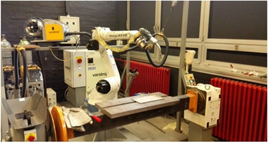 An experiment was carried out in Welding Laboratory at the Faculty of Mechanical Engineering and Naval Architecture, University of Zagreb. WAAM system was constructed particularly for this study, by combining welding robotic hand OTC Almega AX-V6 (six axes of freedom) with MIG welding machine DP-400 (conventional power source) and wire feeder CM-7401. All three devices were supplied by Daihen Varstroj (Lendava, Slovenia). Welding wire used as a feedstock was 1.2 mm diameter duplex stainless steel solid wire Avesta 2205 (Voestalpine Böhler Welding—Hamm, Germany) which is designed for welding DSS grade 2205 or 1.4462). Shielding gas mixture was prepared by Messer Croatia Plin (Zaprešić, Croatia), containing 98% Ar and 2% N2. The substrate was austenitic (grade 304 or 1.4301) stainless steel plate, with dimensions 300 mm × 150 mm × 8 mm. This WAAM system is shown in Figure 1.