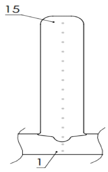 The greatest issue, which is seen without any additional testing is porosity, shown in Figure 4. Groups of pores are located at the external sides. Pores are more present at higher layers, probably because the protection of the shielding gas gets weaker due to its loss in the surrounding air. For the lower layers shielding gas is deflected from the substrate, thus creating more complete protective surrounding. Additionally, a possible explanation could be the turbulences, which can occur due to the hot air. It is easier than the cold air and it ascends along the wall, “breaking” the shielding gas envelope. Even the increased welding speed could be the reason since it could deteriorate shielding gas protection []. These are only assumptions, but they could be interesting and worth enough to be researched further. For example, a kind of shielding gas chamber could be designed and introduced to the process. This idea could help to stop—or at least reduce—shielding gas loss in surrounding air, thus improving the protection of the wall and prevent excessive forming of the pores. However, this issue supports the idea to test milled walls to check for possible porosity at the inside. The porosity should be reduced and there is a room for process improvement during the future research, and the guideline could be the idea presented in papers [,], where the appropriate shielding gas device was designed to improve the protection of the process.