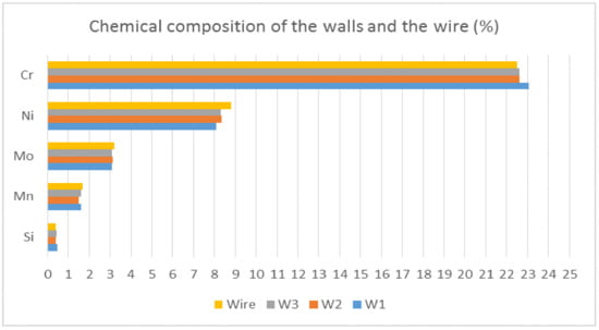 Results of chemical composition testing are shown in Figure 6. It can be seen there were no significant differences between the three walls. Additionally, none of the walls differed from the wire a lot. Clearly, the interlayer temperature did not affect the chemical composition of the walls and—what is even more important—chemical composition of the wire was not altered significantly by the process, so additional material for future research could be chosen without fear of affecting its chemical composition significantly. However, it is crucial to mention the limitation of the device used—it was not possible to detect the N2, which can be higher due to a composition of the shielding gas. Ferrite amount could be a guideline (if it is lower, N2 could be higher if there is more austenite), but further research must focus on finding a way to measure the N2.