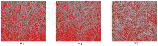 Clearly, an increase in the interlayer temperature caused the ferrite amount to decrease. It is important to mention that there were no significant differences between ferrite amounts at different layers (heights), which means microstructure was quite homogenous. Figure 7 shows some of the images used for analysis. It is easy to see there was more austenite (grey-colored), which formed longer grains growing in the vertical direction, while ferrite grains (red-colored) were mostly staggered on the sides. Some of the black dots were probably carbides or defects made during the preparation of the samples. However, they could be rarely seen. While wire datasheet claimed there was 45–55% of ferrite, W1 had 38.5% and another two walls had even less. This is accordant with results from [], where the lower ferrite amount was also recorded at higher interlayer temperatures. The possible reason could be the shorter idle time—while the previous layer was not cold still, the subsequent layer was already heating it, giving enough time for austenite to form. At lower interlayer temperatures transformation to ferrite could occur while the layer was cooling and the heat input during the next layer deposition was not high enough to cause the transformation to austenite, thus leaving the part with higher ferrite amount. Both phases should be present in roughly equal amounts in DSS, but if they are not it is preferable to have more austenite since it tends to increase some important properties (impact toughness or pitting corrosion resistance). If there are requirements for minimum ferrite amount, an approach suggested in [] could be used. Otherwise, the higher interlayer temperature should be preferable to use since it means it is possible to produce parts faster and they will still have acceptable amounts of ferrite. Lastly, these results are comparable with studies [,,,], which were mentioned in the introduction.