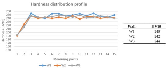 Three different measurements were executed at each point and then the values were averaged and recorded. Force of 98.04 N (10 kp) was used to obtain HV10 hardness results. Thirteen results—without the first 2 points, which belong to the substrate—were then averaged for each wall to get the average hardness value. Additionally, the hardness profile was made for every wall, which shows the distribution of hardness values through the part.