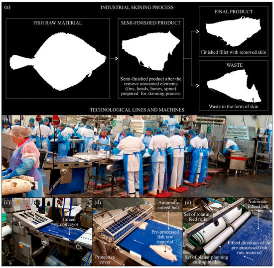 The production process carried out on the technological line for the processing (skinning) of flat fishes from Pleuronectidae family, based on the example of the a medium-sized fish processing plant (Espersen Koszalin Sp. z o.o., Koszalin, Poland): (a) general diagram of the industrial skinning process; (b) general view of one of the technological lines; (c)automatic skinning machine ST600 (Steen F.P.M. International, Kalmthout, Belgium); (d) close-up of the infeed conveyor a pre-processed raw fish material; (e) close-up of the set of planar cutting blades mounted under the rotating feed rolls.