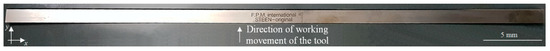 All of the planar cutting blades, whose condition after the technological process was presented in the previous subsection, were subjected to regeneration. This process, described in detail by Zieliński et al. [26,27], consisted of renewing the cutting ability—restoring the original shape and recreating correct cutting edges angles of inclinations. The effects of the regeneration were verified using high-accuracy contact (stylus) [27] and noncontact (optical) [26] measurement systems for determining its correctness. Numerous parametric analyses confirmed the possibility of this type of regeneration carried out using the precision traverse surface grinding process (in peripheral and front grinding kinematics). However, it was not optimal for all of the machined planar cutting blades’ edges. Much less favorable results were obtained for peripheral grinding process realized at vw = 300–400 mm/min and ns = 38,000 min−1.