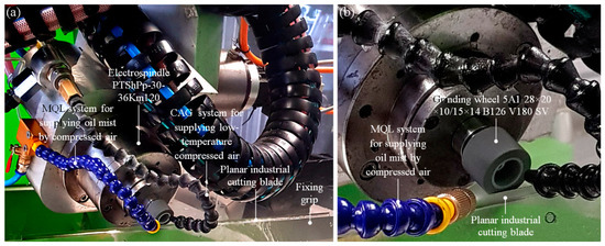 The regeneration process of cutting edge of all selected planar cutting blades was realized using a five-axis CNC grinding machine, described in detail by Zielinski [26]. As shown in Figure 3a, the central part of the technological machine contains an electro-spindle PTShPp-30-36Km120 (FŁT-Kraśnik S.A., Kraśnik, Poland) with a grinding wheel 5A128 × 20 × 10/15 × 14B126V180SV (Inter-Diament, Grodzisk Mazowiecki, Poland); the machining conditions are given in Table 3.