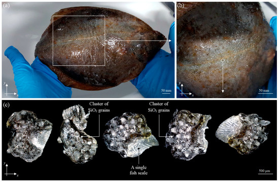 European plaice ♂ (Pleuronectes platessa): (a) general view of the specimen before the processing; (b) close-up of part of the body with a small-sized randomly located SiO2 grain clusters; (c) examples of extracted fish scales with visible SiO2 grain clusters.