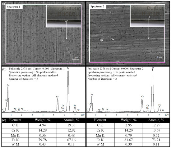 Energy-dispersive X-ray spectroscopy (EDS) quantitative microanalysis of the surface of the planar cutting blade (reference): (a) SEM micrograph of two selected areas (11.07 × 8.27 μm) for which a microanalysis was carried out; (b) conditions of EDS microanalysis and EDS spectra obtained with identified elements contained in the analyzed areas; (c) calculated weight and atomic percentages of elements.