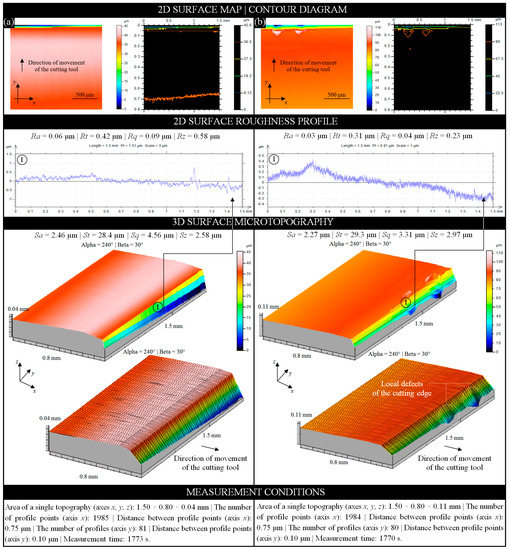 Figure 6 presents example analyses prepared in TalyMap Silver 4.1 software using Mountains Technology® (Digital Surf, Besançon, France) for two planar cutting blades. The samples were selected to show different forms of wear. Figure 6a presents the analyses obtained for sample B1-4 in the form of a two-dimensional (2D) surface map (indexed colors), contour diagram (color curves mode, indexed colors), and 3D surface microtopography (continuous and meshed axonometric mode) with a single extracted 2D surface roughness profile. The above analyses were supplemented with the determined values of selected basic roughness (profile; Ra, Rt, Rq, and Rz) and amplitude (surface; Sa, St, Sq, and Sz) parameters. The conditions under which the measurements were performed are given at the bottom of the Figure 6a.