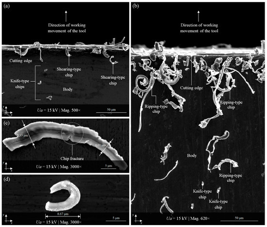 For one of the samples (B1-3) ground with these kinematics, imaging (with magnification from 500× to 3000×) of the cutting-edge surface and cutting products (flow-type chips) was obtained by scanning electron microscope JSM-5500LV (JEOL Ltd., Tokyo, Japan). Some examples of the results obtained for this sample are shown in Figure 8. Figure 8a,b offer a vast panorama of a fragment of the B1-6 sample surface with a visible cutting edge and body immediately after the regeneration process. The cutting edge was not yet devoid of machining products (they were left on purpose for later observation); after regeneration, it was always thoroughly cleaned and washed. In this case, different types of flow-type chips can be observed. These include ripping-type, shearing-type, and knife-type chips. All of these subtypes are visible in Figure 8a,b. The morphology of shearing-type and knife-type chips is depicted in more detail in Figure 8c,d, respectively.