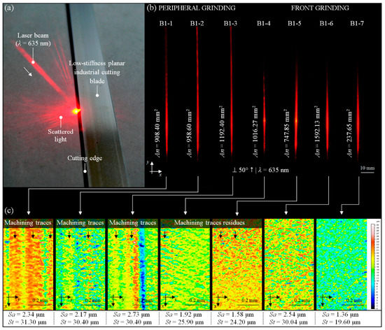 A fragment of the regenerated cutting edge of the planar cutting blade B1-5 illuminated by the beam (λ = 635 nm) from the laser source is shown in Figure 9a. The images of the angular distribution of scattered light intensity, acquired for all of the analyzed samples (B1-1–B1-7), are presented in Figure 9b. A visual analysis of these distributions shows their differences in the case of peripheral and front grinding. A visual analysis of these distributions showed their differences in the case of peripheral and front grinding. The second kinematic obtained more favorable results, which was also confirmed by the values of An (area of the bright regions of an image of scattered light). The average area value (Anavr = 1019.80 mm2) calculated for samples regenerated by peripheral grinding was higher than that for samples regenerated by front grinding (Anavr = 898.47 mm2). For sample B1-7, the lowest value (An = 237.65 mm2) was obtained, while, for sample B1-6, the highest value was obtained (An = 1592.13 mm2). The 2D surface maps, corresponding with images of the angular distribution of scattered light intensity from Figure 9b, are presented in Figure 9c. The 2D surface maps in indexed colors (height of the surface elements encoded with the given color) were generated in TalyMap Silver 4.1.2 (Digital Surf, Besançon, France) software on the basis of measurement data obtained using a multisensory optical profilometer Talysurf CLI2000 (Taylor-Hobson, Leicester, Great Britain). Furthermore, for comparison purposes, the figure also includes the calculated values of the amplitude (surface) parameters—Sa and St. These values indicate much better results obtained for face grinding, which is a more efficient process than peripheral grinding.
