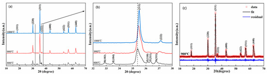 (a) X-ray diffraction (XRD) pattern of (FeCoCrMnZn)3O4 powders calcined at 800, 900, and 1000 °C, respectively; (b) partially enlarged XRD patterns (32–38°), where peaks indexed with (E), (H), (T), and (S) correspond to eskolaite, hetaerolite, cobalt manganese oxide, and Co3O4-like spinel phases, respectively; (c) Rietveld refinement XRD pattern of the powders calcined at 900 °C.