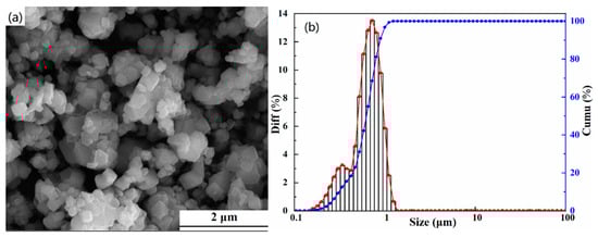 Figure 2 demonstrates the SEM image and particle size distribution diagram of the (FeCoCrMnZn)3O4 powders calcined at 900 °C for 2 h. Irregular particles with some agglomeration can be observed from Figure 2a. It can be seen in Figure 2b that the particle size of the (FeCoCrMnZn)3O4 powders was mainly between 0.5 μm and 1 μm with a normal distribution, and the average particle size was 0.65 μm.