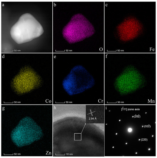 In order to better understand the crystal structure of (FeCoCrMnZn)3O4 powder, it was further determined by TEM (Figure 3). Figure 3b–g show the energy-dispersive X-ray spectroscopy (EDS) analysis of O, Fe, Co, Cr, Mn, and Zn elements. We can find that all metal elements in the grain were uniformly dispersed, without obvious reunion. All results indicate that (FeCoCrMnZn)3O4 powder was chemically and structurally homogeneous. In addition, the HR-TEM image of (FeCoCrMnZn)3O4 powder is shown in Figure 3h. The interplanar space value (0.294 nm) obtained from the HR-TEM images is very close to that of the (220) crystal plane of the spinel structure (PDF#34-0140, 0.296 nm), which matches with the results of XRD analysis (Figure 1a). The fast Fourier transfer (FFT) generated in the same area shows that the powder possessed a typical face-centered cubic (fcc) structure, and the diffraction spots are also marked in Figure 3i. The diffraction pattern could be identified as a face-centered cubic spinel structure, which is in accordance with the XRD pattern.