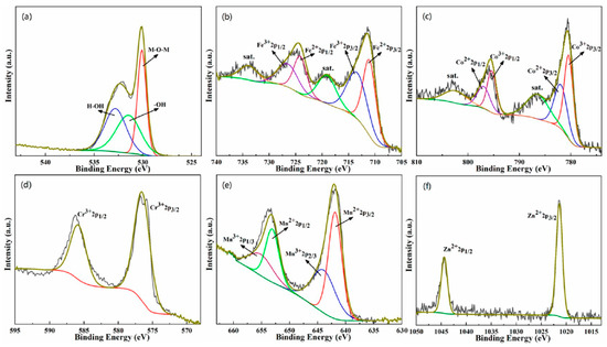 Figure 4 is the XPS peak spectrum of each element in the (FeCoCrMnZn)3O4 powder. The peak spectrum of O 1s in Figure 4a shows that the peaks at 530, 531.5, and 532.8 eV corresponded to metal oxygen bonds, surface-adsorbed oxyhydroxide, and surface physical/chemically adsorbed H2O, respectively. Figure 4b–f show the XPS spectra of Fe, Co, Cr, Mn, and Zn metal elements. The XPS analysis indicates that Fe, Co, and Mn cations in (FeCoCrMnZn)3O4 HEO were at the valences of both +2 and +3 states, while Cr was in the +3 state and Zn was in the +2 state.