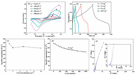 Electrochemical characteristics of the (FeCoCrMnZn)3O4/nickel foam (NF) composites: (a) cyclic voltammetry (CV) curves, (b) galvanostatic charge-discharge (GCD) curves, (c) corresponding specific capacitance (SCs) at different current densities, (d) cycling performance at a current density of 5 A·g−1, and (e) electrochemical impedance spectra (EIS).