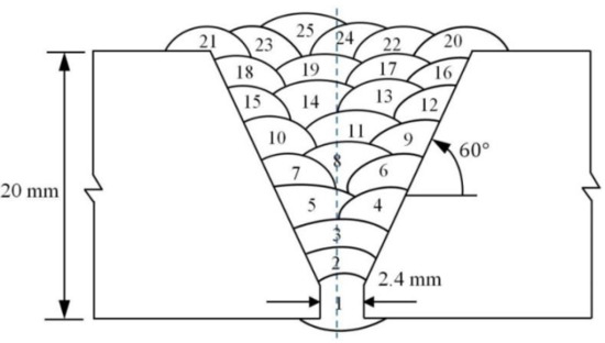 The root pass of the V-prep joint was completed with MSAW (pass 1-MSAW), and FCAW was used for the remaining passes (pass 2–25). Two different filler materials were used for welding of the specimens; ER70s-6 electrode and E81TNi class Flux cored wire were used to complete the root pass (pass 1) and the remaining passes (pass 2–25) of the welded joints, respectively. The sketch of the deposited weld is shown in Figure 1, and the chemical compositions of the consumable (electrodes) and base material are presented in Table 1 (for base material, measurement of nitrogen and carbon content were done by using ELTRA and LECO combustion analyzers, respectively).