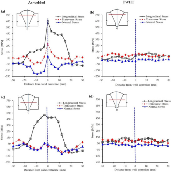 Figure 5a–d shows the distribution of residual stresses across the weld (3 mm below the weld top surface and mid-plate thickness) for the as-welded and PWHT specimens. Tensile residual stress higher than the yield strength of both the parent and weld metal (the yield strengths of the parent and weld metal are 543 MPa and 532 MPa, respectively, see Section 3.3.2) was observed at 3 mm below the weld top surface along the weld centerline for the as-welded specimen; see Figure 5a. High magnitude of tensile residual stress (in longitudinal direction) in this region may be due to the deposition of the last and final weld pass, and therefore, there is no further weld passes that could impart a tempering effect as it is the case for the previous passes in multipass welds. In addition, it is expected to have differential thermal gradient across the last weld pass as for every pass of multipass weld joint, but the lack of tempering effect in the last pass leaves the differential thermal gradient untouched exacerbating this effect (weld passes 20–25). However, with the increase in the depth of measurement (mid-plate thickness or 10 mm below the weld top surface) a reduction in the magnitude of residual stresses is detected due to the tempering effects of the subsequent passes; see Figure 5c.
