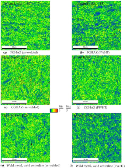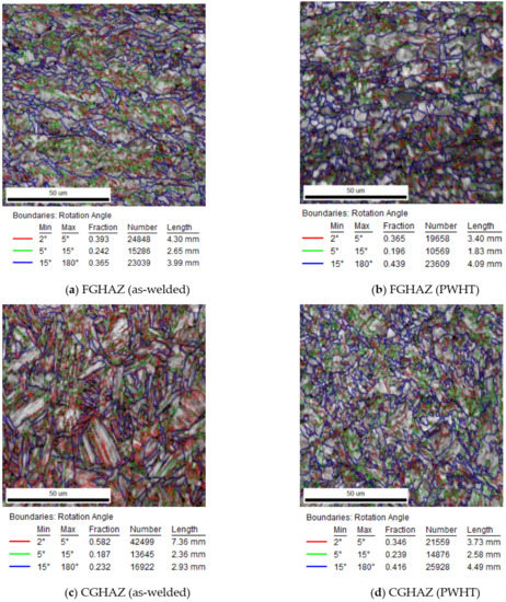The application of EBSD enables to better differentiate between the morphologies of the weld micro-constituents as illustrated in Figure 9. The formation of a mainly acicular ferrite morphology for the FGHAZ (Figure 9a) and WM (Figure 9e) and formation of mainly bainitic morphology for CGHAZ (Figure 9c) are easily recognizable. Furthermore, the formation of coarsened structures for FGHAZ and CGHAZ and transformation of acicular ferrite into polygonal ferrite for the WM in the PWHT samples are also well-represented in Figure 8b,d,f. EBSD analysis also provides information on the crystallographic orientations of constituent phases and imperfections such as grain boundaries enabling to distinguish between low and high angle boundaries through degrees of misorientations. It further provides a useful visualization of the microstructure.