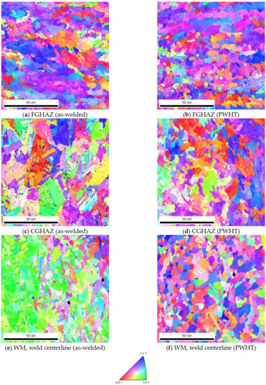 EBSD IPF (Inverse Pole Figure) micrographs showing the FGHAZ, CGHAZ and the WM in the as-welded (a,c,e) and after PWHT (b,d,f) specimens.
