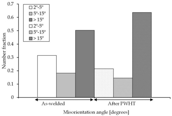 Misorientation angle distributions for the WM (as–welded and PWHT specimen), taken from weld centerline in the middle of plate thickness.