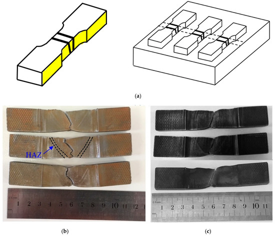 (a) Schematic representation of tensile test coupons prepared from the welded plates (yellow highlights show the gauge length of samples); (b) standard size tensile and (c) sub-sized tensile specimens (all dimensions are in mm).