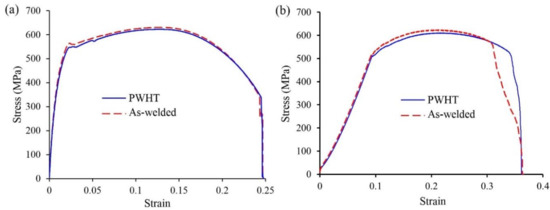 Moreover, the fracture surface in all cases shows ductile fracture characteristics with dimpled fracture surface). Figure 16a,b are typical tensile diagrams for the standard and sub-sized specimens respectively. For the as-welded sample (sub-sized), there is some anomaly at the end of tensile test where the stress-strain curve shows some further elongation at fracture. This may be explained with respect to the crack path seen in the middle as-welded sample in Figure 15a. The crack propagation from both sides ends up in the middle with some step characteristics. The extra elongation may be due to joining of the two crack paths from either side of the sample.