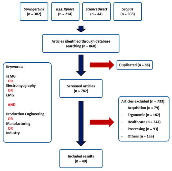 After identifying articles from the selected databases (n = 868), duplicates were removed (n = 86), and a first screening was conducted to evaluate title and abstract (n = 782). The full-text reading was done after the first screening for articles that offered valuable information in the title and abstract. Articles and reviews that present real cases of use in production engineering, whether real or simulated, are selected (n = 49). Discarded articles could be classified as Healthcare if they evaluate the development of prosthesis and orthosis, augmentation exoskeletons for rehabilitation or other purposes; Acquisition was used for those analyzing sensor and electrodes technologies. Processing articles investigate about feature selection, classification algorithms, and methods, and finally, Ergonomic articles are those assessing ergonomics performance, muscle fatigue, and kinematics estimations not applied to production engineering. Discarded articles classified as Others could not be classified in any other category and do not involve an EMG or production engineering research topic. Articles that cannot be accessed are also classified under this category.