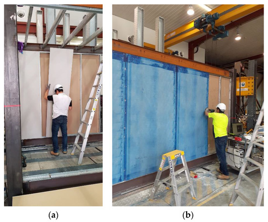 After the LSF was mounted, the infill panels were firmly connected to the tracks and studs were screwed at 300 mm on centre spacing to form a complete coupling between the steel module and the infill walls. As illustrated in Figure 4, the infill panels used in this study were 10-mm-thick gypsum plasterboard linings, as well as 7.5-mm-thick cement-board (blue-board) sheets. The infill panels were mounted on both sides of the studs in each bay to form a double-sided sheathed wall comprising different interior and exterior layouts. The gypsum plasterboards attached on both sides of studs resemble an interior partition wall as shown in Figure 5a, while the cement-boards (or blue-boards) installed at outer side of the studs, represented an exterior wall, as shown in Figure 5b.