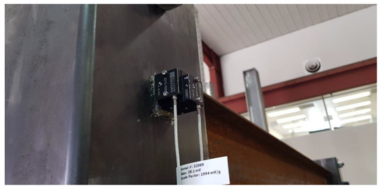 The OMA procedure is adopted in this study to investigate the contribution of infill walls with different materials on the natural dynamic properties of the single steel module. In the OMA, it is not needed to record the input excitations, and just the output vibration response of the system is recorded. For recording the vibrations of the steel module, it is instrumented with six single-axis accelerometers. They are micro-electro-mechanical systems (MEMS technology) manufactured by Silicon Design Company (Kirkland, WA 98034 USA). High nominal sensitivity of 2 V/g makes them appropriate for applications where the level of accelerations is low as it is common in civil engineering structures. They have full scale range of 2 g, output voltage of ±16V, and output noise of 10 μg/(root Hz). The accelerometers are installed at the top of module’s columns along the middle axis of ceiling beams through accompanied mounting kits as shown in Figure 6.