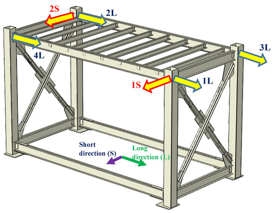 Four accelerometers were oriented along the module’s long bay and named as 1L to 4L, and the remaining two were oriented along the short bay with the name of 1S and 2S. The orientation and naming convention of accelerometers are shown in Figure 7. The data acquisition system consists of a multi-channel National Instrument (NI) data logger with shielded four-core low noise cables. The NI data acquisition system was supported by LabVIEW software (v.2017, NI, Sydney, NSW, Australia) to synchronously record the accelerations at the rate of 1 K sample per second.