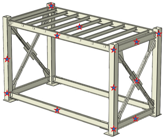 As input for the operational modal testing, the ambient accelerations of the system were recorded for the bare (frame only) module, and then for the different walled cases of II, IE, and EE, listed in Table 1. For exciting different natural modes and better capturing, in addition to the pure ambient vibrations, the module is impacted randomly with a rubber hammer at different locations and its free vibration response is recorded. These locations are bottom, middle and top points of the columns, middle points of the floor and ceiling beams, middle of the braces, and the middle point of the ceiling joists as representatively shown in Figure 8. These tests are repeated for all testing cases. The artificial impacts are of different intensities and orientations such that different modes of the bare module, and coupled module-wall system to be excited. The hammer impacts may produce acceleration orders of 0.01 g, 0.1 g and 1 g, such that the contribution of the wall system can be examined at different shaking levels. During ambient and free vibration tests, the acceleration response of the steel module is recorded for 5 s, with 5K sampled data. A low-pass filter with a cut-off frequency of 200 Hz was applied to the data to remove undesired noises.