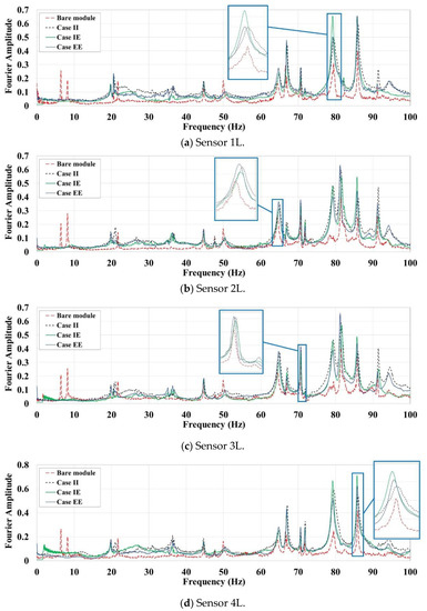 For the S-oriented sensors along the short direction in Figure 10, almost the same peaks are observed for all test cases. The little differences can be mainly related to the presence of the infill walls not to their material. As it is expected, adding partitions in one direction has negligible effects on the frequencies of another direction. Also, concurrent peaks in averaged FFT plots of L- and S-oriented sensors, essentially above 40 Hz, may be an indication of modes with torsional shapes that have components along with both module’s perpendicular main directions. The peaks related to translational modes of the system along the long direction are not observed in the FFT plots of the S-oriented sensors.